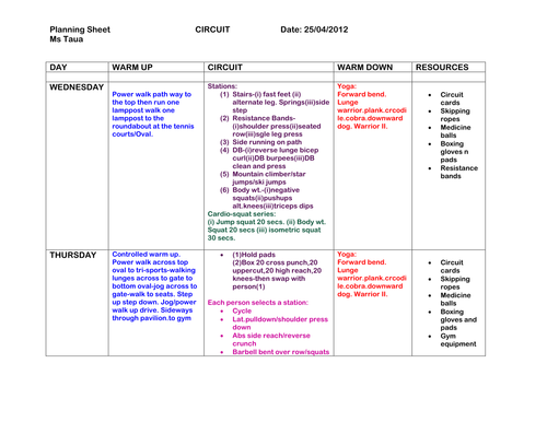 LESSON PLAN. Subject. PE Class. 12PE Unit. Methods of training Topic. Weight Training. Achievement Objective(s) AO7A1 Learning Outcome(s) and/or Learning Intentions. What should the students learn? Describe what a circuit training lesson comprises of. Assessment and/or Success Criteria. ... View Document